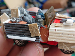 It's fun to just cut up tiny blocks of plasticard and stick it in the back of the vehicle. I imagine these to be tool boxes and the like. There are a few bits from GW in there too like the flamer.
